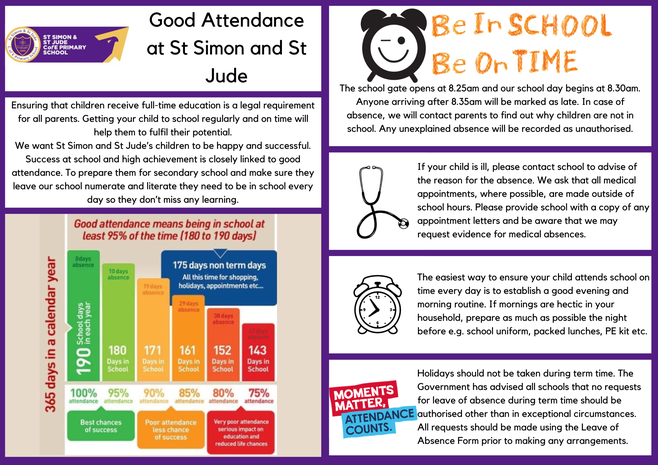 At St Simon and St Jude CofE Primary School we place an emphasis on the importance of regular and punctual school attendance. We believe through good attendance at school children will achieve higher attainment, have better opportunities and establish good habits that will support them throughout their lives.